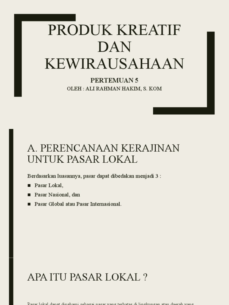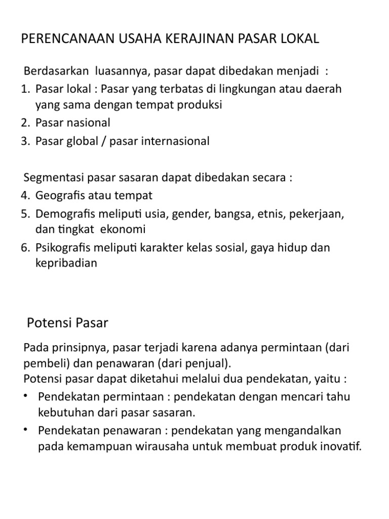 Produk yang dibuat harus sama kualitasnya dengan yang ada di pasaran a. USAHA KERAJINAN UNTUK PASAR LOKAL PDK XII Semester 5 Mengenal Pasar Sasaran Berdasarkan luasannya pasar dapat dibedakan menjadi pasar local pasar nasional dan pasar global Internasional Pasar lokal dapat dipahami sebagai pasar yang terbatas dilingkungan atau daerah yang sama dengan tempat produksi Segmentasi pasar. Pendekatan ini untuk mengenali potensi pasar.